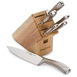 The eight kitchen knives in this set provide a cook with a variety of cutting edges, with the centerpiece 8-inch cook's knife for rocking through chopping and mincing tasks. The cook's knife is purposely ground extra thin for the ultimate cutting performance, and chopping through bones will damage its fine edge. Other knives in the set include an 8-inch carving knife for meats and poultry; an 8-inch serrated bread knife for crusty loaves; a 6-inch sandwich knife; a 4-1/2-inch utility knife for myriad slicing and cutting needs; a 5-inch serrated salami/tomato knife with a pronged tip; a 5-inch boning knife; and a 3-1/2-inch paring knife. The set also includes a 9-inch sharpening steel for keeping knife edges aligned and a maple block to store everything on the counter within reach. Like all fine cutlery, the knives should be hand washed. They're backed by a lifetime warranty. --Fred Brack