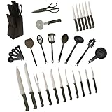 HomeBasics by Ginsu has any kitchen cutlery need covered without breaking the bank!Ginsu's heritage as an innovator among cutlery manufacturers is assured with the dual-sided serrated design that allows for a straighter, more even cut. That, combined with the unique inverted scallop edge, doesn't tear at food like typical needle teeth grinds. The result is no maintenance, never needs sharpening, serrated edge that performs with the accuracy of fine edged professional cutlery.Each polypropylene handle is textured for a non-slip comfortable grip that is permanently bonded to each blade for durability and strength. The satin finished Japanese stainless steel blade is corrosion resistant. These products are dishwasher safe and are covered under a limited lifetime warranty.Our wonderful 36 Piece Cutlery Set includes a chef's knife, slicer/carver, carving fork, utility knife, boning knife, specialty knife, fruit/vegetable knife, mini utility knife, eagle beak paring knife, traditional paring knife, apple corer/peeler, 6 steak knives, long turner, slotted spoon, slotted turner, spoon, ladle, pasta rake, set of 5 measuring cups, set of 5 measuring spoons, pizza cutter, kitchen shear and a solid hardwood storage block packed into a colorful gift box. This would be the perfect addition to any kitchen.
