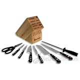 The Classic cutlery line bears all the traits that Wusthof knives are known for: impeccable construction, incredible sharpness, and long-lasting durability. Each Classic knife is precision-forged--blade, bolster, and tang--from a single piece of high-carbon, stain-resistant steel. The blade is tested by lasers and honed by hand, with computer-controlled front-to-back tapering, grinding, and polishing. A visible full tang--the blade's shaft runs the entire length of the handle--ensures excellent balance and strength. Classic handles are molded from a durable black synthetic called Hostaform-C with traditional triple riveting. The knives promise a lifetime of hard-working companionship in the kitchen. This Wusthof Classic 9 piece block set is a great way to jumpstart your cutlery collection or begin overhauling your old set of knives. Designed to meet the most popular cutting demands, the set includes an 7" Santoku knife for chopping, and a 3-1/2-inch paring knife for coring, trimming, and peeling, 3" Asain parer for fruits and vegitables,4.5" multi prep knife is for the small jobs that need more than just a paring knife to do the job.This sets also includes a 5" tomato, 8" Hollow carving knife, kitchen shears. Wusthof also includes a 9-inch sharpening steel and an attractive oak block with a total of 17 slots so you can add specialty knives or your old favorites.Classic knives, though safe in the dishwasher, should be washed by hand for best results.